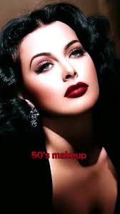 The 1950s saw a smooth matte often pale complexion in style, with well-defined eyebrows shaped with a soft arch. Eyeliner was winged or in a “cat-eye” style, eyeshadow was typically in a subtle matte shades like grey, blue, or brown, and mascara was generously applied to add fullness. Lips were often a bold red shade, and blush was rosy and pastel toned.